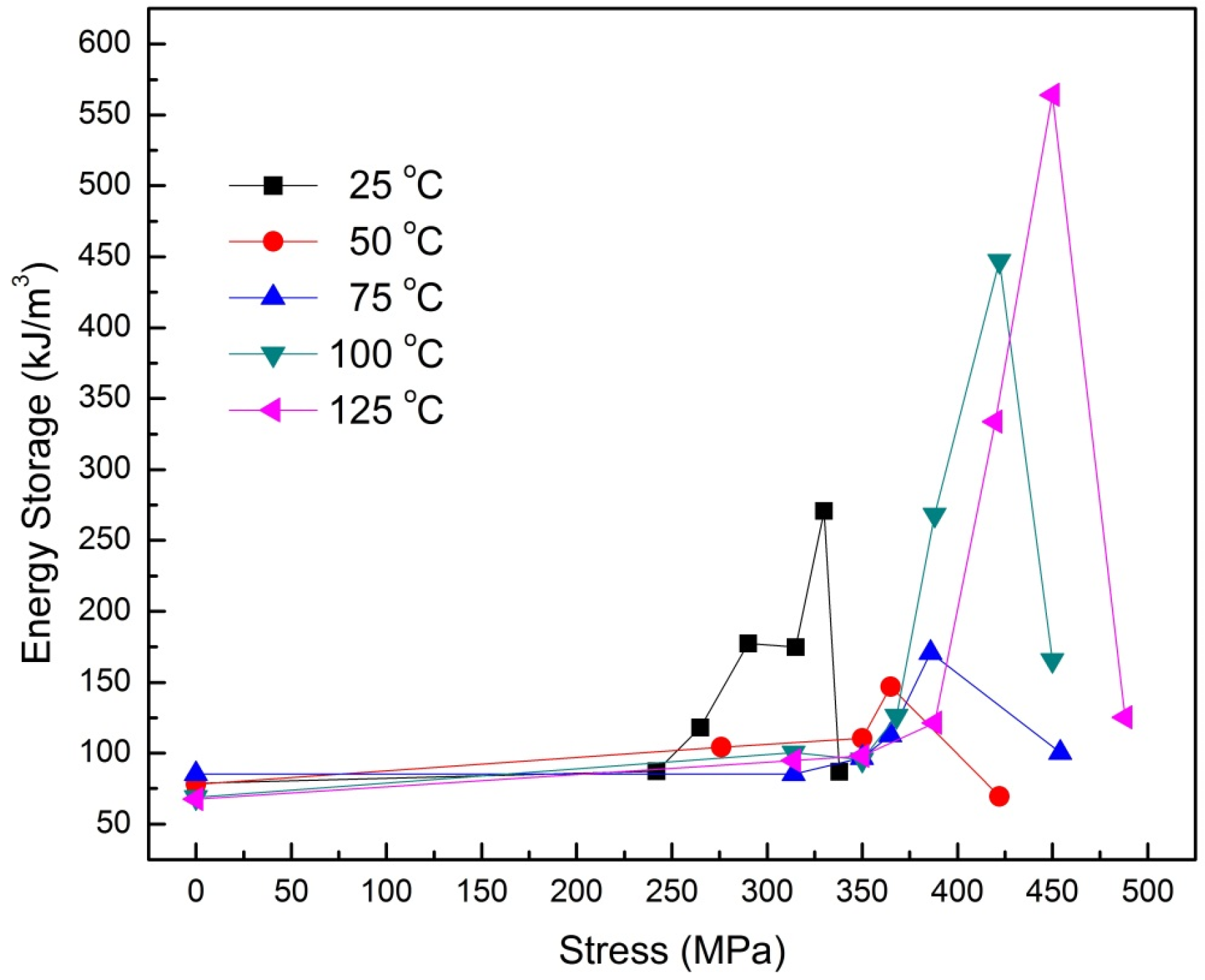 In recent work, Dong et al. reported the pressure, temperature, and electric field dependence of phase transformations in Nb modified 95/5 PbZrTiO3 bulk ceramics [108]. Here, the bulk ceramics were subjected to electric field hysteresis under the application of varying temperature and applied hydrostatic pressure. An interesting observation was that under a sufficiently high pressure (>300 MPa at 25 °C) a FE to AFE phase transformation can be induced. The double hysteresis loops became more pronounced on increasing the pressure up to 500 MPa while any significant increase in temperature or electric field was observed to hinder the formation of this pressure induced AFE phase. Figure 6 shows the P-E hysteresis loops of the bulk ceramics, obtained as a function of hydrostatic pressure at the temperatures of 25 and 125 °C. In addition, Figure 7 shows the energy storage density of these ceramics as a function of stress and temperature. A maximum energy density of 0.55 J/cm3 was obtained at a temperature of 125 °C for an applied pressure of 450 MPa. The study holds promising results and must be extended to other compositions to see if there is potential to improve the energy storage density in such ceramics.