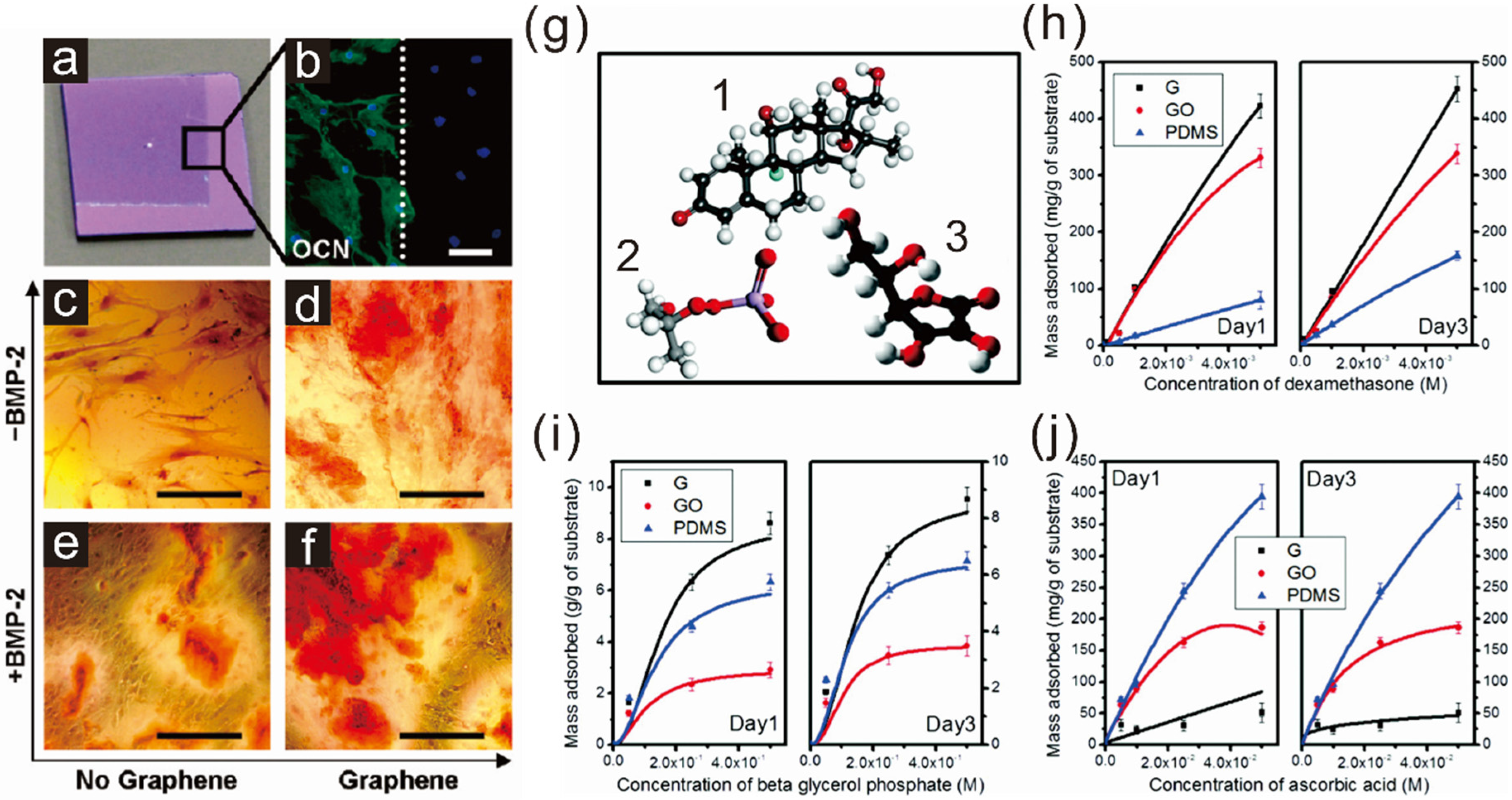 Acceleration of osteogenic differentiation of mesenchymal stem cells. (a) Image of partially graphene-coated Si/SiO2 substrate; (b) Cells on graphene showing enhanced expression of one of the representative osteogenic marker, osteocalcin (OCN); (c–f) Enhanced calcifications of cells on graphene-coated substrate confirmed by alizarin red staining. Reprinted with permission from [41]. Copyright 2011 American Chemical Society. Scale bars = 100 μm; (g) Chemical structures of three different molecules responsible for osteogenic differentiation: (1) dexamethasone, (2) beta glycerol phosphate anion, and (3) ascorbic acid; (h–j) Loading capacity of (1–3) on graphene (G), graphene oxide (GO), and PDMS. Reprinted with permission from [42]. Copyright 2011 American Chemical Society.