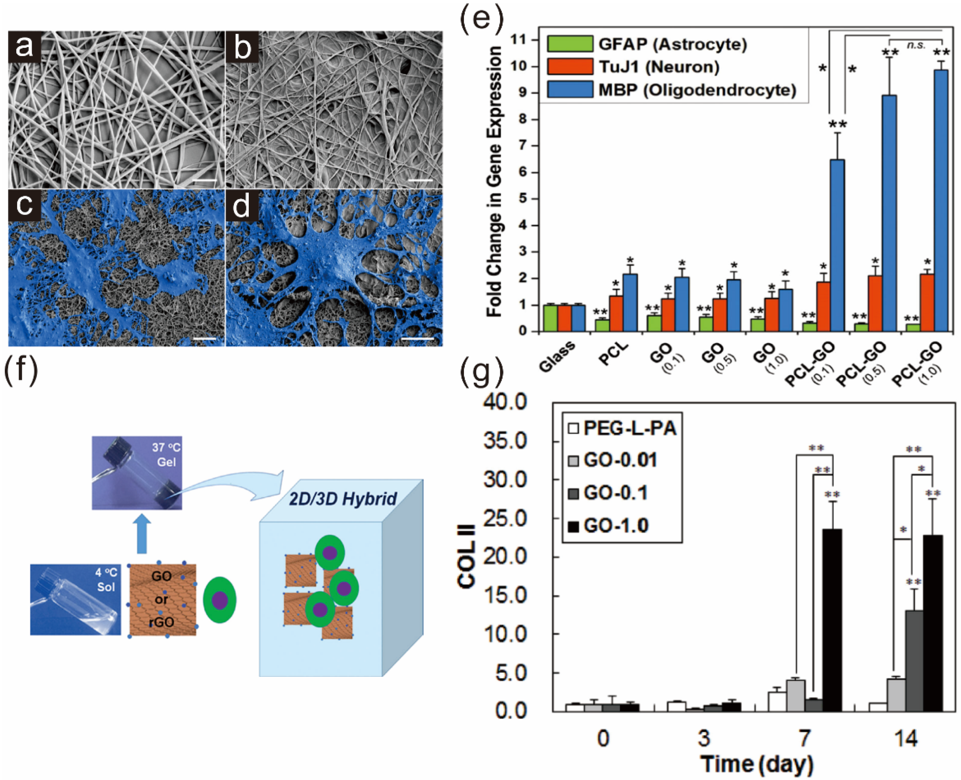 Graphene hybrid scaffolds enhancing stem cell differentiation into specific lineages: (a) nanofiber scaffold; (b) graphene-nanofiber hybrid scaffold; and (c–d) differentiated neural stem cells on graphene-PCL nanofiber scaffolds. Scale bars = 10 μm; (e) Quantitative analysis of several markers such as GFAP (astrocyte), Tuj1 (neuron), and MBP (oligodendrocyte). GO-modified PCL nanofibers showed the highest expression of MBP. Student’s unpaired t-test was used for calculating significance (* p < 0.05, ** p < 0.01, n.s. = no significance). Reprinted with permission from [46]. Copyright 2014 John Wiley and Sons; (f) Schematic diagram depicting the preparation of the 2D/3D hybrid cell culture platform; (g) Enhancement of chondrogenic marker (COLII) during the TMSCs culture in GO-containing polymer scaffolds. Reprinted with permission from [48]. Copyright 2014 John Wiley and Sons.