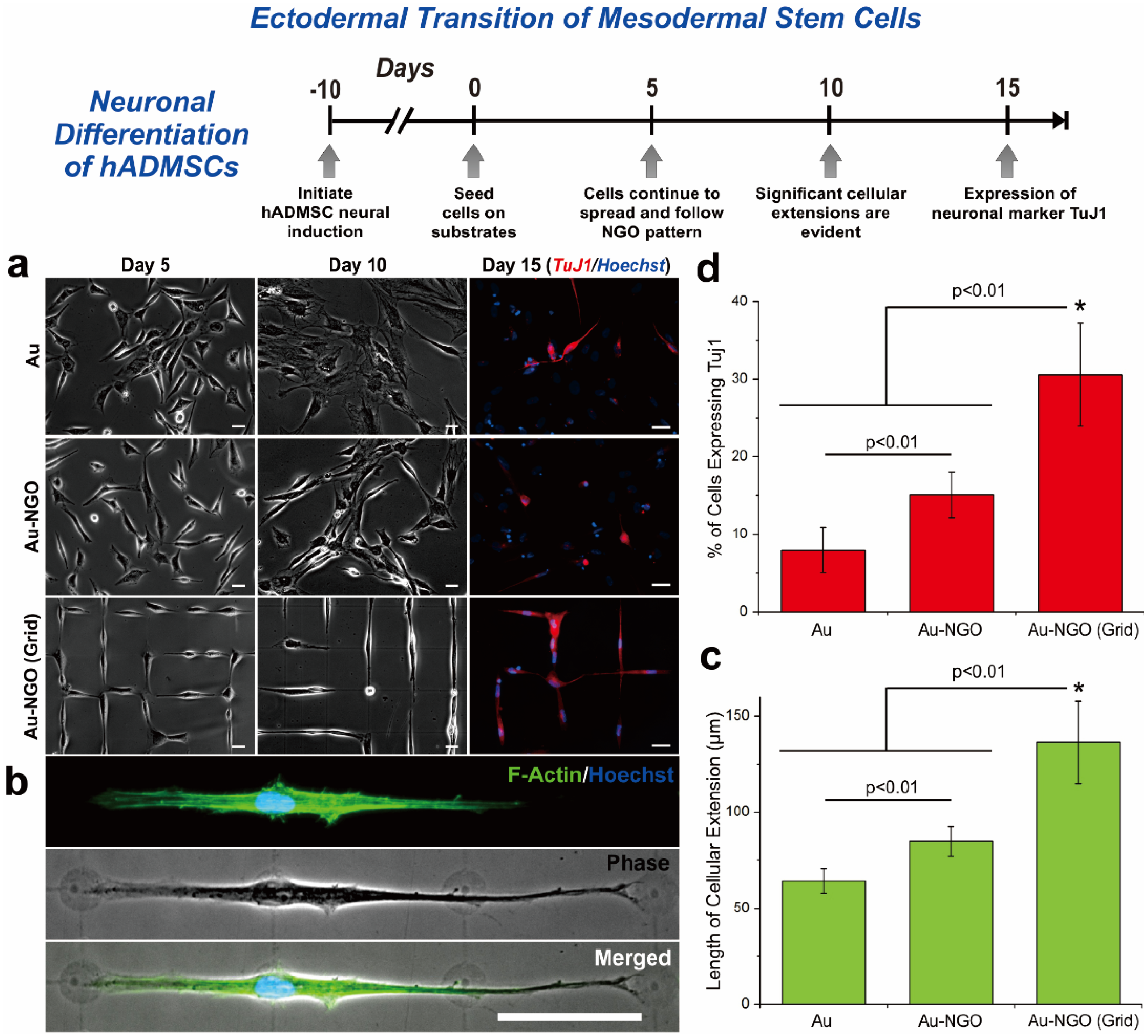 Neuronal differentiation of hADMSCs using NGO grid-patterned substrate. (a) Pictures of hADMSCs cultured on PLL-coated Au [Au], NGO-coated Au [Au-NGO], and NGO grid-patterned substrates [Au-NGO (Grid)]. Differentiation of hADMSCs confirmed by the neuronal marker TuJ1 (red) and nucleus (blue). Scale bars = 20 μm; (b) Optical and fluorescence images of hADMSCs stained for F-actin (green) and nucleus (blue). Scale bar = 50 μm; (c) Quantitative analysis of the length of cellular extension on various substrates (n = 3; * p < 0.01, Student’s unpaired t test); (d) Quantitative analysis of the percentage of cell showing the neuronal marker TuJ1 on various substrates (n = 3; * p < 0.01, Student’s unpaired t test). Reprinted with permission from [82]. Copyright 2015 American Chemical Society.