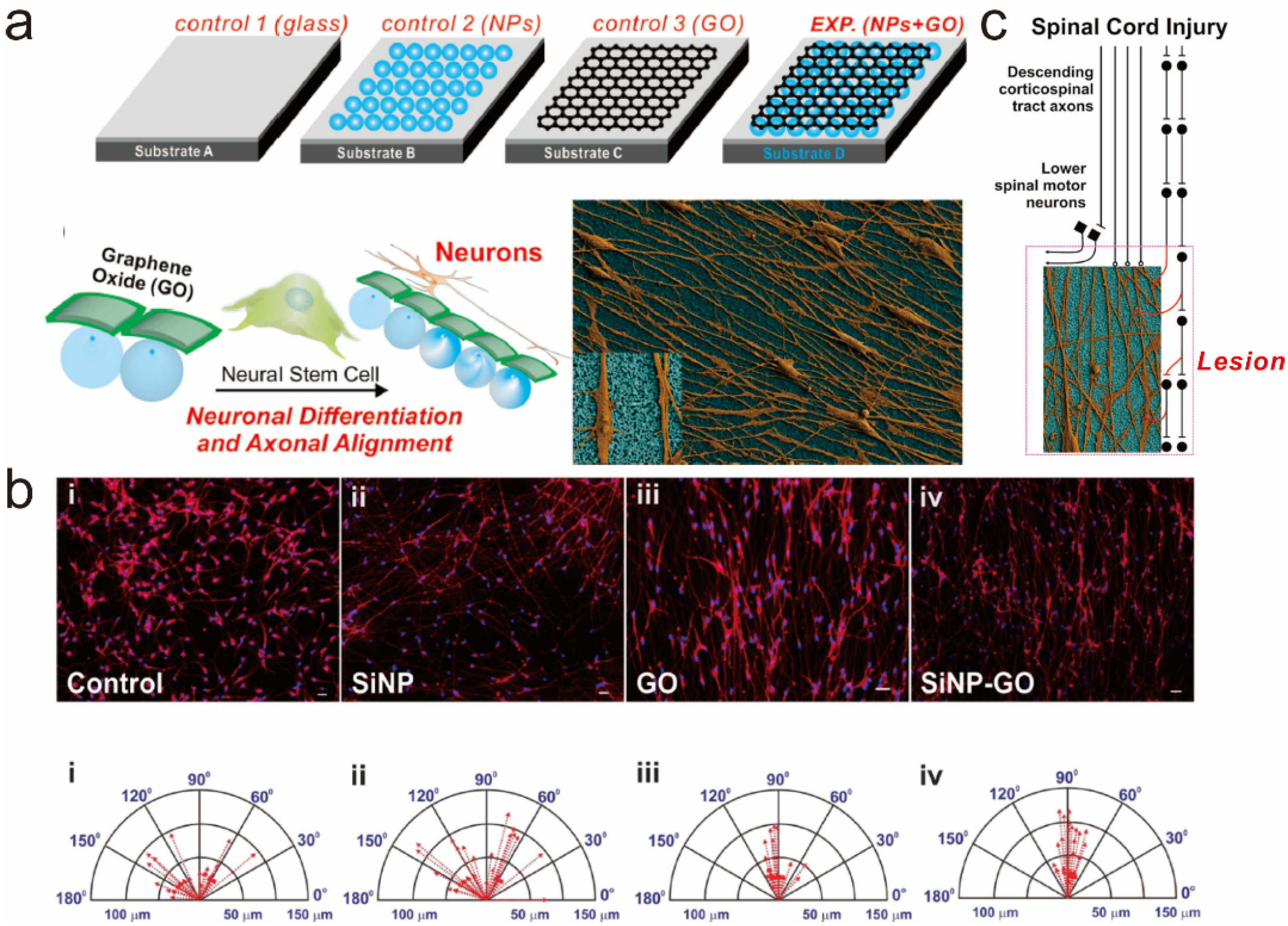 (a) Schematic diagram representing the effects of GO-coated nanoparticle hybrid construct on the differentiation of hNSCs and the alignment of the axons of differentiated neurons; (b) Comparison of aligned growth of differentiated hNSCs on different substrates [(i) Glass, (ii) SiNP-modified glass, (iii) GO-modified glass and (iv) SiNP-GO-modified glass]. Scale bars = 10 μm; (c) Possible strategy for utilizing the GO-coated nanoparticle hybrid construct (SiNP–GO) to treat spinal cord injury. Reprinted with permission from [85]. Copyright 2013 John Wiley and Sons.
