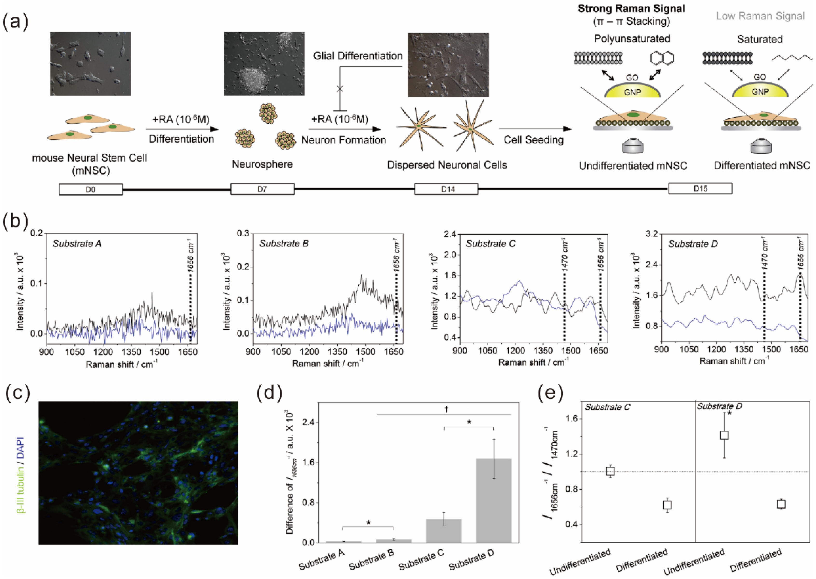 (a) Schematic diagram depicting the method to distinguish the undifferentiated and differentiated state of mouse neural stem cells (mNSCs) using 3D GO-encapsulated gold nanoparticles; (b) Raman signals achieved from undifferentiated (black) or differentiated (blue) mNSCs on different substrates including indium tin oxide (ITO, Substrate A), GO-modified ITO (Substrate B), gold nanoparticle-modified ITO (Substrate C), and ITO modified with GO-encapsulated gold nanoparticles (Substrate D); (c) Fluorescence images of differentiated mNSCs on Substrate D proving the successful differentiation of mNSCs to neurons; (d) Intensities of Raman peak (1656 cm−1) obtained from undifferentiated mNSCs subtracted by differentiated cells; (e) Relative Raman intensities at 1656 cm−1 divided by the intensities at 1470 cm−1. * p < 0.05, Student’s t-test. Reprinted from [50], Copyright 2013, with permission from Elsevier.