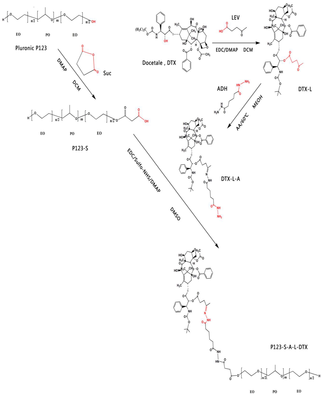 Under the above considerations, it is important to seek feasible hydrazone linkage construction method to prepare the pH sensitive conjugates. In this study, we chose the widely used triblock copolymer Pluronic P123 (P123) as the carrier to construct our polymer-docetaxel conjugates (P123-DTX). To achieve the pH-dependent characteristic, the hydrazone contained derivative of DTX was prepared via a two-step reaction, so that the hydrazone linker was formed before their combination with the carriers. The micelles formed by these P123-DTX conjugates were also evaluated and investigated to verify its potential to balance the stability and drug release.