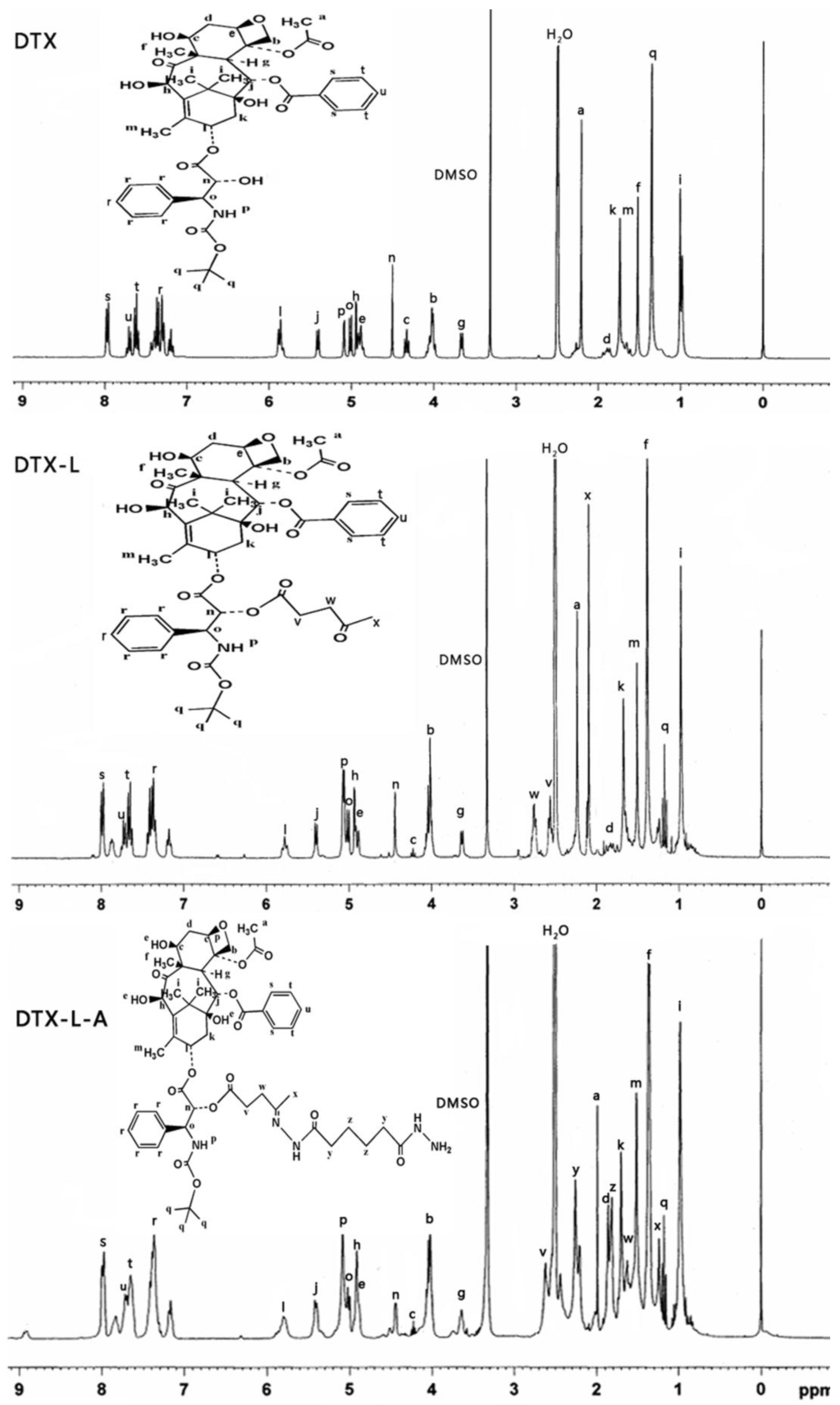 The hydrazone contained derivatives of DTX was achieved by the reaction of the DTX-L and adipic dihydrazide (ADH). Briefly, DTX-L (20.6 mg) and ADH (40.2 mg) were dissolved in 3 mL anhydrous methanol (MEOH) under stirring at 60 °C. The reaction was performed for 4 h after addition of acetic acid (AA, 40 µL/mL of reaction mixture). Then the reaction solution was cooled to 25 °C, filtered and recrystallized from methanol. Finally, silica gel column chromatography was used for purification.