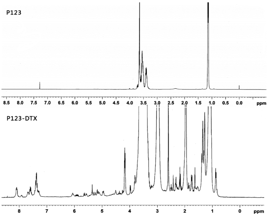 Before the combination with the Pluronic P123, DTX was chemically modified to form the linker contained derivatives, which is important to exhibit its pH sensitive behavior. It had been reported that the modification of taxanes by levulic acid could be an effective way in forming the pH sensitive conjugate to fulfill the issue of stability and controlled release [20,21,22]. Therefore, the derivatives of the DTX was synthesized: (1) modification of DTX with a levulic acid (DTX-L); (2) synthesized the hydrazone bond contained derivative of DTX (DTX-L-A) by coupling the levulic acid-modified DTX with adipic dihydrazide. To be better conjugated, the carriers were also modified to achieve the Pluronic P123 derivatives: the succinic acid-modified Pluronic P123 (P123-S). The derivatives of DTX and Pluronic P123-DTX conjugates were characterized by 1H NMR, respectively (Figure 2 and Figure 3).