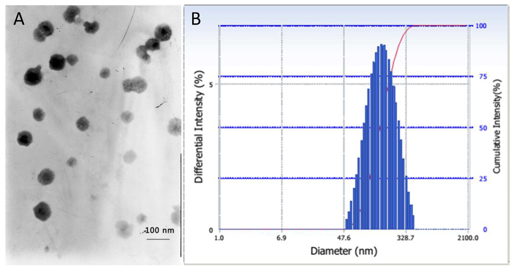 The particle size is another crucial parameter for drug delivery, which could dramatically affect the in vivo pharmacokinetics and distributions of the conjugate micelles [25]. The particle size and size distribution of P123-DTX conjugate micelles were measured by dynamic light scattering (DLS) and their morphology were visualized by transmission electron microscopy (TEM) (Figure 4). These P123-DTX conjugate micelles were well dispersed as individual particles with spherical shape and showed an average diameter about 138 nm. With the limiting size less than 200 nm, these conjugate micelles could beneficial for more drug accumulation in solid tumors due to Enhanced Permeation and Retention effect (EPR effect) [26].