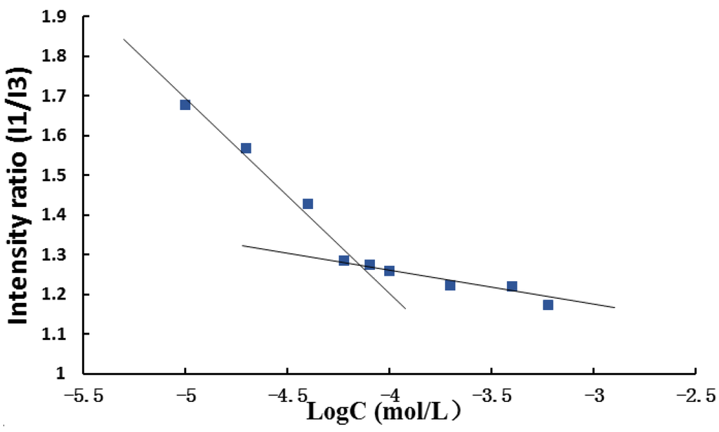 The hydrophobic aggregation ability played an important role to form the micelles and protect the hydrophobic drugs from the cleavage of the system. In this respect, the critical micelle concentrations (CMC) of these conjugates could be used as the fundamental parameter to characterize the thermodynamic stability of micelles (Figure 5). The critical micelle concentration (CMC) of the P123-DTX conjugates was determined using the fluorescence probe technique as we described previously [24]. The fluorescence intensity ratios of pyrene at 373 and 383 nm (I373/I383, I1/I3) were calculated and plotted against the concentration logarithm of the P123-DTX conjugates. It could be seen in Figure 5, as the polymer concentration increased above the CMC, the I1/I3 value experienced a rapid decline process, because the probe pyrene was incorporated into the hydrophobic core of the micelles. The CMC was determined by taking the inflection point of the pyrene I1/I3 ratio plot. The measured CMC value of the P123-S-A-L-DTX conjugates was ~7.232 × 10−5 mol/L (~502.2 µg/mL). It also indicated that the Pluronic P123-DTX conjugates could form micelles in lower concentration, which would be helpful to form the stable micelles.