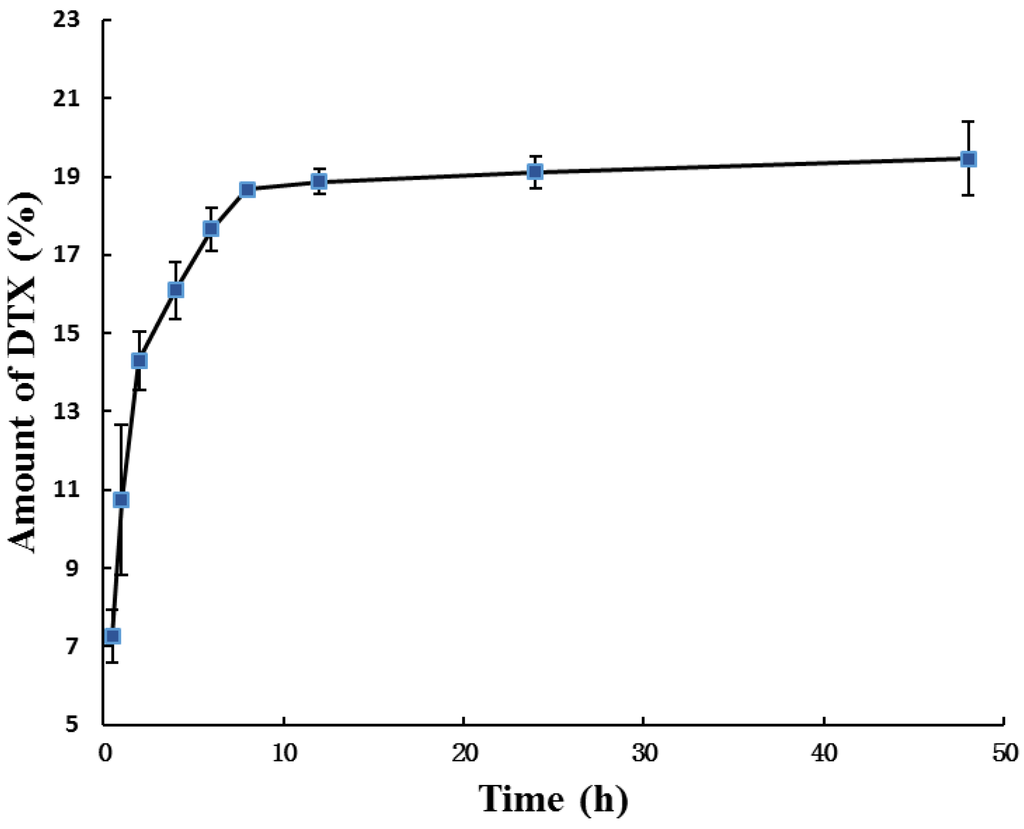 In our study, the pH sensitive P123-DTX conjugate micelles were added into rat plasma and the amount of released DTX and DTX-L were quantified by high-performance liquid chromatography (HPLC) (Figure 6). Although DTX was linked to P123 by covalent hydrazone bond, both of the pH sensitive micelles formed by conjugates still exhibited a sustained release profile within 10 h. After released for 48 h, the cumulative release amount of DTX (and DTX-L) from conjugate micelles was only about 19.5%. These observations showed that our prepared conjugate micelles had a favorable stability around blood circulation.