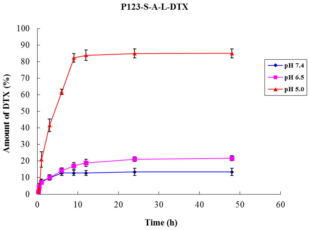 We examined the DTX release from the two P123-DTX conjugate micelles at different pH Values. In order to release the drug at target sites (at mildly acidic pH level), the acid-cleavable hydrazone linkage was introduced to combine DTX and Pluronic P123. The P123-DTX conjugate micelles were incubated for 48 h at pH 5.0, 6.5 and 7.4. The total extent of the released drug was calculated as the sum of DTX and DTX-L using the HPLC method. The results showed that the hydrolysis rates of hydrazone linkage in the conjugate micelles were pH-dependent (Figure 7). As expected, DTX released more efficiently at lower acidic pH (pH 5.0), and the release extents of the conjugate micelles could reached above the 80% (~84.9%) at 48 h. It was near six times higher than the release profile at physiological pH level (pH 7.4), which was only about 13.4% released from the conjugate micelles at 48 h.