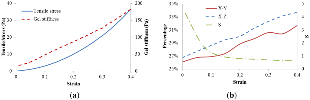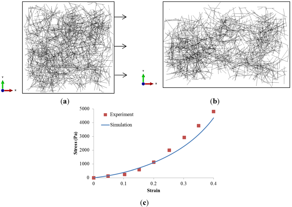 The experimental work by Roeder et al. [] was simulated using our RVE model subjected to 40% strain along x-direction as shown in Figure 2a. The fiber diameter was measured as 435 nm with the Young’s modulus of 79 MPa, and the crosslink threshold was assumed as 450 nm. The fiber network strain was estimated from the relative edge displacement. The fiber network stress along x-direction was calculated by the edge reaction force divided by the total fiber cross-section area on the y–z plane. The stress-strain relationship of 3D collagen gel was depicted in Figure 2c, with comparison to the experimental measurements. It was clear that our RVE simulation agreed well with the experiments, especially at strain less than 20%. The discrepancy at larger strain could be explained by the actual heterogeneous fiber dimensions.