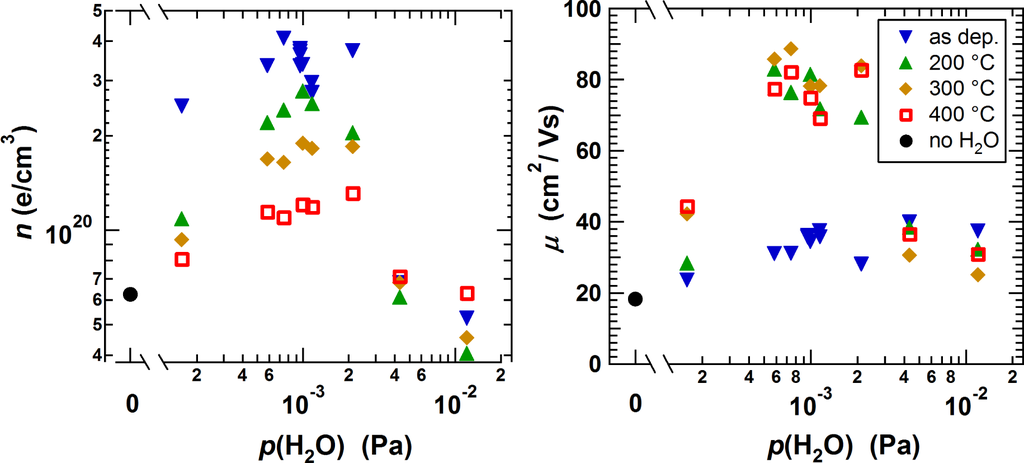 Room temperature Hall effect measurements of films deposited with p(H2O) between 1.6 × 10−4 Pa and 1.2 × 10−2 Pa were conducted. The values of n and μ are shown in Figure 1 for both as-deposited films and for films later annealed at 200, 300 and 400 °C for 2 h in vacuum. For comparison, n and μ of a non-annealed film deposited at RT without additional H2O is shown. The results are comparable to the results obtained by Koida et al. []. With the addition of H2O to the sputter gas, a significant increase of the carrier concentration for the as deposited films can be seen with a maximum of n = 4.1 × 1020 cm−3 at p(H2O) ≈ 10−3 Pa. For p(H2O) > 2 × 10−3 Pa, n decreases again. The former can be explained by an increasing donor doping with hydrogen as has been stated in literature [,] since H is expected to act as effective donor in In2O3 [,]. With increasing annealing temperatures n decreases, which is likely related to an increased degassing of H at higher temperatures []. Films deposited with p(H2O) around 10−3 Pa show a significant increase of μ from 30–40 cm2/Vs up to 90 cm2/Vs after annealing. This phenomenon will be discussed further below.