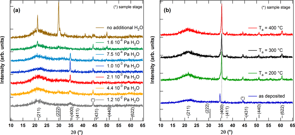 Thin films of indium oxide were deposited on quartz glass substrates (CrysTec) by radio frequency magnetron sputtering from a ceramic In2O3 target. The target was purchased from MaTecK and had a purity level of 99.999%. The films were deposited using pure argon as sputtering gas under room temperature at a sputter power of 25 W and 0.5 Pa total pressure. To avoid unintentional heating of the substrate from the plasma, a target-to-substrate distance of 10 cm was used. Water vapor was added to the process gas during the deposition []. The water vapor partial pressure (p(H2O)) was introduced from a water reservoir, and the p(H2O) in the chamber was controlled by a leak valve. Due to p(H2O) being much smaller than the process gas pressure during sputtering, p(H2O) had to be adjusted before the introduction of the process gas into the chamber and could not be controlled during deposition. The mean value of the pressure before process gas introduction and the H2O pressure after the deposition (i.e., when sputter gas was switched off) is used as p(H2O). Unfortunately, this results in a large error of p(H2O) of up to half an order of magnitude for some samples. Films with a thickness around 340 nm, measured via profilometry, were obtained with a deposition time of 75 min. Post deposition vacuum annealing was conducted at 200, 300 and 400 °C for 2 h in the deposition chamber with a base pressure of 10−7 mbar. A heating rate of 10 K/min was chosen.