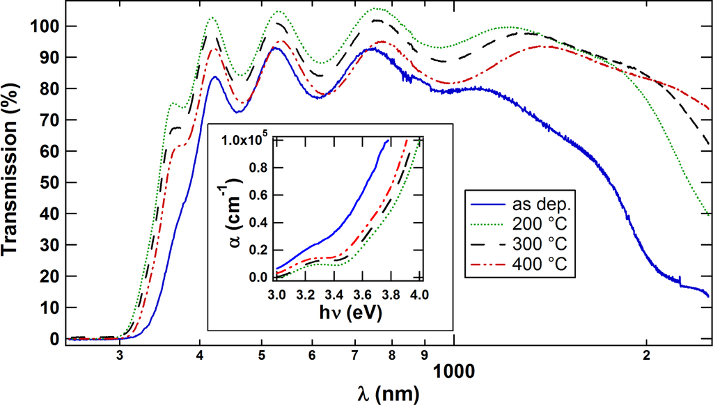 Optical transmission measurements of the films deposited with p(H2O)= 10−3 Pa before and after annealing for 2 h at 200, 300 and 400 °C are shown in Figure 3. Compared with the as-deposited film, a higher NIR transmission is observed for the annealed films. This is considered to be due to a lower reflection caused by the lower carrier density in these films. In the visible region of the light all films show good transmission above 80%. The difference in the position of the absorption edges of the annealed films can also be attributed to the difference in carrier density. Note that n decreases with increasing annealing temperature, which results in a decreasing Burstein–Moss effect [,]. Thus, a decrease of the optical band gap can be seen for higher annealing temperatures. The absorption edge of the as-deposited film is at significantly lower energies. This is contrary to the Burstein–Moss shift for the annealed films, since the as-deposited film has the highest n and should therefore have a larger optical band gap than the annealed films. A possible explanation for this could lie in the as-deposited film being mostly amorphous. Due to the disorder in the amorphous phase, optical transitions that are usually parity forbidden in cubic In2O3 [] could occur and lead to an optical band gap similar to the fundamental gap. A reduced band gap for a-In2O3 is also predicted by theory [,].
