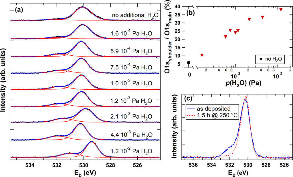 The results from the in situ XPS measurements of In2O3 films deposited with different p(H2O) are shown in Figure 4a. Shifts of the O1s emission lines with p(H2O) are parallel to shifts of the In3d core level and valence band maximum (data not included) and are therefore related to different Fermi level positions at the surface, excluding the sample deposited with p(H2O)= 4.4 × 10−3 Pa, which showed charging during the XPS measurement. These changes of Fermi level position are consistent with differences in carrier concentration as shown in Figure 1. The O1s emission lines of the films consist of a main emission line and a shoulder at approximately 1.7 eV higher binding energy, which can be attributed to In2O3 and In(OH)3, respectively []. Changes of the shape of the In3d emission lines cannot be observed for the films. According to Donley et al. the binding energy of the In3d level in In(OH)3 is at 444.8 eV [], which is within 200 meV of the binding energy of the In3d level of our samples as well as for undoped In2O3 samples []. The presence of hydroxide therefore cannot be distinguished from In2O3 from the indium core level emission. For this reason, changes of hydroxide content with p(H2O) are estimated from the O1s emission lines in the following. The integrated intensities of the fits for the O1s shoulder and main emission are compared in Figure 4b. With increasing p(H2O), a significant increase of the shoulder intensity occurs. This indicates an increased hydroxide formation with increasing p(H2O). From the intensity ratio of shoulder-to-main emission, the hydroxide film thickness at the surface is estimated to be less than 1 nm. Following the route of formation, it is likely that hydroxide is also present in the interior of the film, but with a lower concentration than at the surface because the surface is exposed to H2O for some time after the deposition. After vacuum annealing, the shoulder emission disappeared (see Figure 4c), which can be explained by hydroxide decomposition during annealing. The decomposition of indium hydroxide is in good agreement with thermal desorption spectroscopy (TDS) measurements from Koida et al., showing a pronounced H2O desorption peak at ∼135 °C and a broad desorption plateau at 220–380 °C []. The authors suggest that the peak of H2O desorption at ∼135 °C occurs with crystallization and originates from physically adsorbed and hydrogen bonded water molecules trapped at the surface of pores in the amorphous films. The broad desorption signal at higher temperatures is attributed to internal H2O related species in the film, which require diffusion to grain boundaries and/or the surface before desorption []. From our XPS results, we propose that the H2O desorption is likely related to the decomposition of In(OH)3 according to the chemical reaction 2 In(OH)3 → In2O3 +3 H2O. Desorption of H2O by the decomposition of indium hydroxide may induce void formation, which would agree with literature, where void formation has been observed in In2O3:H films after annealing [].
