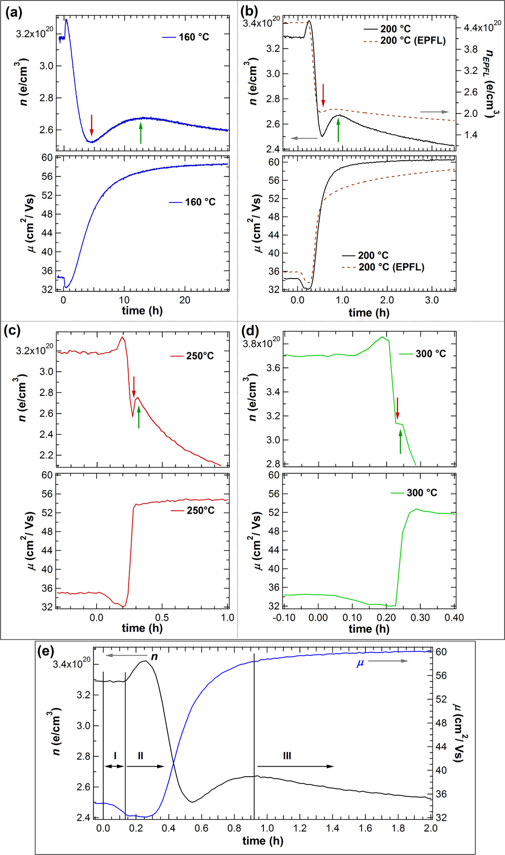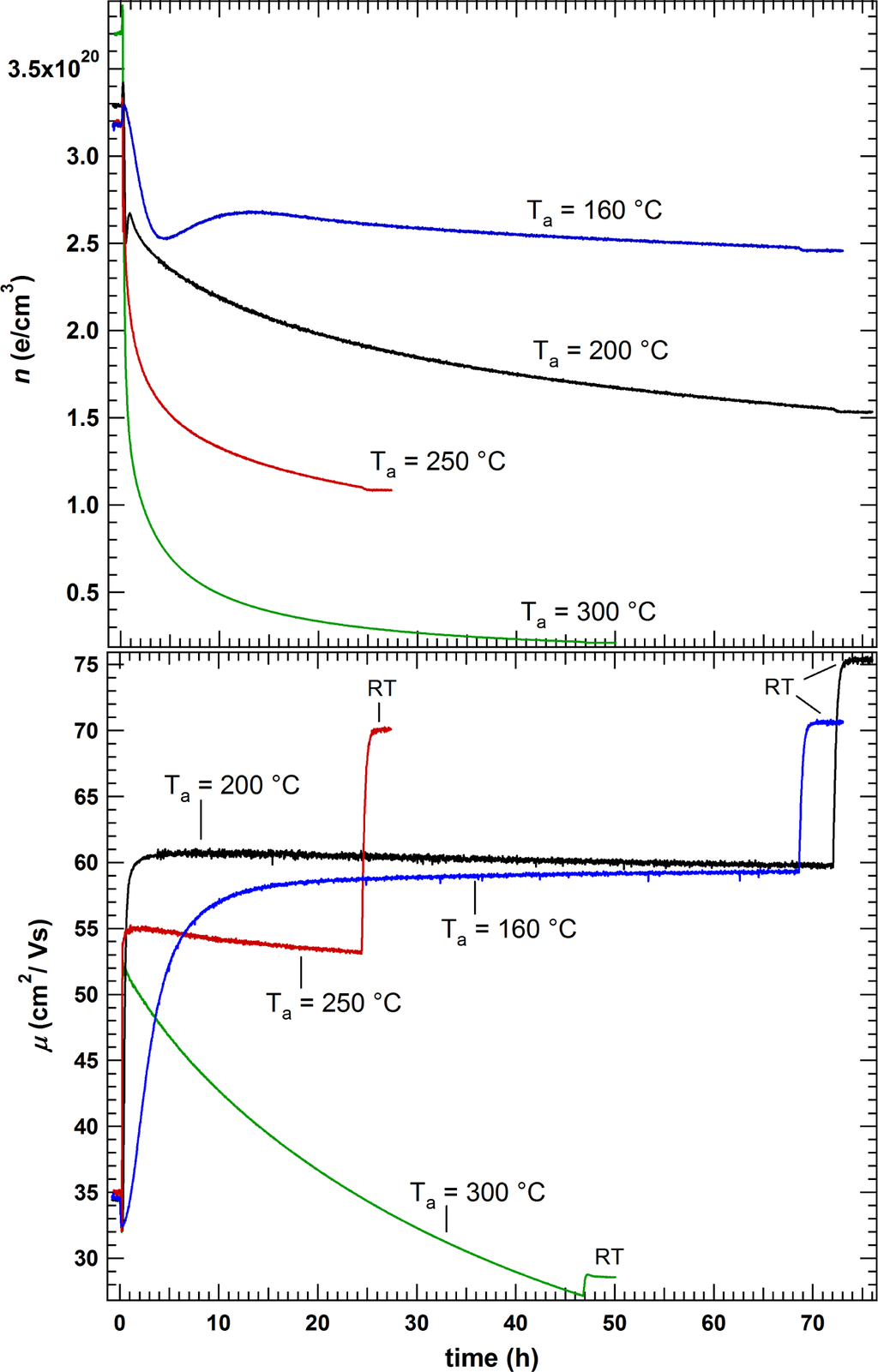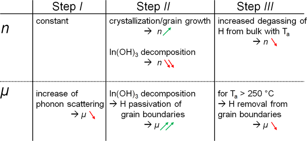 Step III includes a general decline of carrier concentration with time and increasing annealing temperature (see Figure 5). This is assigned to a degassing of H, hence a decreasing donor concentration in In2O3. For temperatures ≥ 250 °C, also the mobility decreases with annealing time. A reasonable explanation for this is the removal of H from the grain boundaries, resulting in non-passivated grain boundaries and higher transport barriers for electrons.