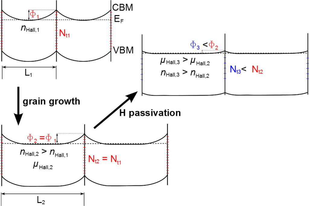 In the following, a model is proposed to explain the observed changes of n and μ during vacuum annealing. For this purpose, the time evolution is divided into three steps (Figure 6e). Step I consists of the heating ramp of the furnace. Only a slight decrease in μ due to an increase of phonon scattering in the film can be seen, which is expected for degenerate semiconductors []. The electron concentration remains constant during this phase. In step II overlaying processes take place. There are at least two different processes with differing kinetics influencing n: one is increasing and the other is decreasing the carrier concentration. First, n increases while μ remains unchanged. It is suggested that this increase and the increase to the second local maximum of n is caused by the same effect, namely crystallization followed by grain growth. Considering a model of a polycrystalline material with depleted grain boundaries, it seems reasonable that for small grains, the depletion layer at the grain boundary could cause a reduction of the average carrier concentration in the grain. This effect would decrease with increasing grain size, resulting in an increase of effective carrier concentration (Figure 7). Crystallization and grain growth are considered to be superimposed by the decomposition of In(OH)3 that could release oxygen and hydrogen within the crystallizing film. A release of oxygen would decrease the donor defect concentration or increase the acceptor defect concentration, i.e., the concentration of and [], respectively. We suggest that the release of O is responsible for the drop in carrier concentration. The hydrogen from the decomposition of In(OH)3 may saturate grain boundary states, thus leading to lower effective trap densities. This would decrease potential barriers at grain boundaries for electron transport (Figure 7). This mechanism is suggested as the main reason for the high mobility obtained in these films [,]. It is noted that for very small grain sizes a reduction of band bending and the depletion layer at grain boundaries could also be partly responsible for the increase of carrier concentration.