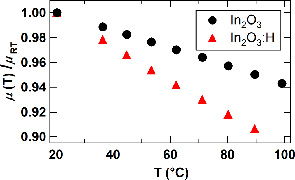 Indium oxide is a wide band gap semiconductor commonly employed as transparent electrode material in electrochromic windows, flat panel displays, organic light-emitting diodes and solar cells [–]. It is mostly used as Sn-doped In2O3 (ITO). While high conductivities can be achieved with ITO, it has a high reflectivity in the infrared (IR) region of the light spectrum. The latter is a desired property for thermal insulation coatings for windows (low-E windows) [,] but it is a problem for devices that require near-IR (NIR) transparency, e.g., solar cells with an absorber material with an energy gap around 1 eV. Here, reflection of NIR light causes a reduction of the photocurrent of the solar cell. To achieve a transparent conductive oxide (TCO) film with a good NIR transparency, lower charge carrier densities (n) are required. To simultaneously still maintain high conductivities, the carrier mobility (μ) needs to be significantly higher. Koida et al. have shown that with hydrogen-doped In2O3 high carrier mobility (exceeding 100 cm2/Vs) can be achieved and reported a way to prepare such films by sputter deposition with the addition of H2O to the sputter gas and subsequent annealing in vacuum [–]. Employing such films as electrode for a-Si:H/c-Si heterojunction solar cells has been reported to improve solar cell efficiency [,]. Nevertheless, the origin of the high mobility obtained with In2O3:H films compared with undoped In2O3 films is still a matter of debate and will be further discussed in this work.