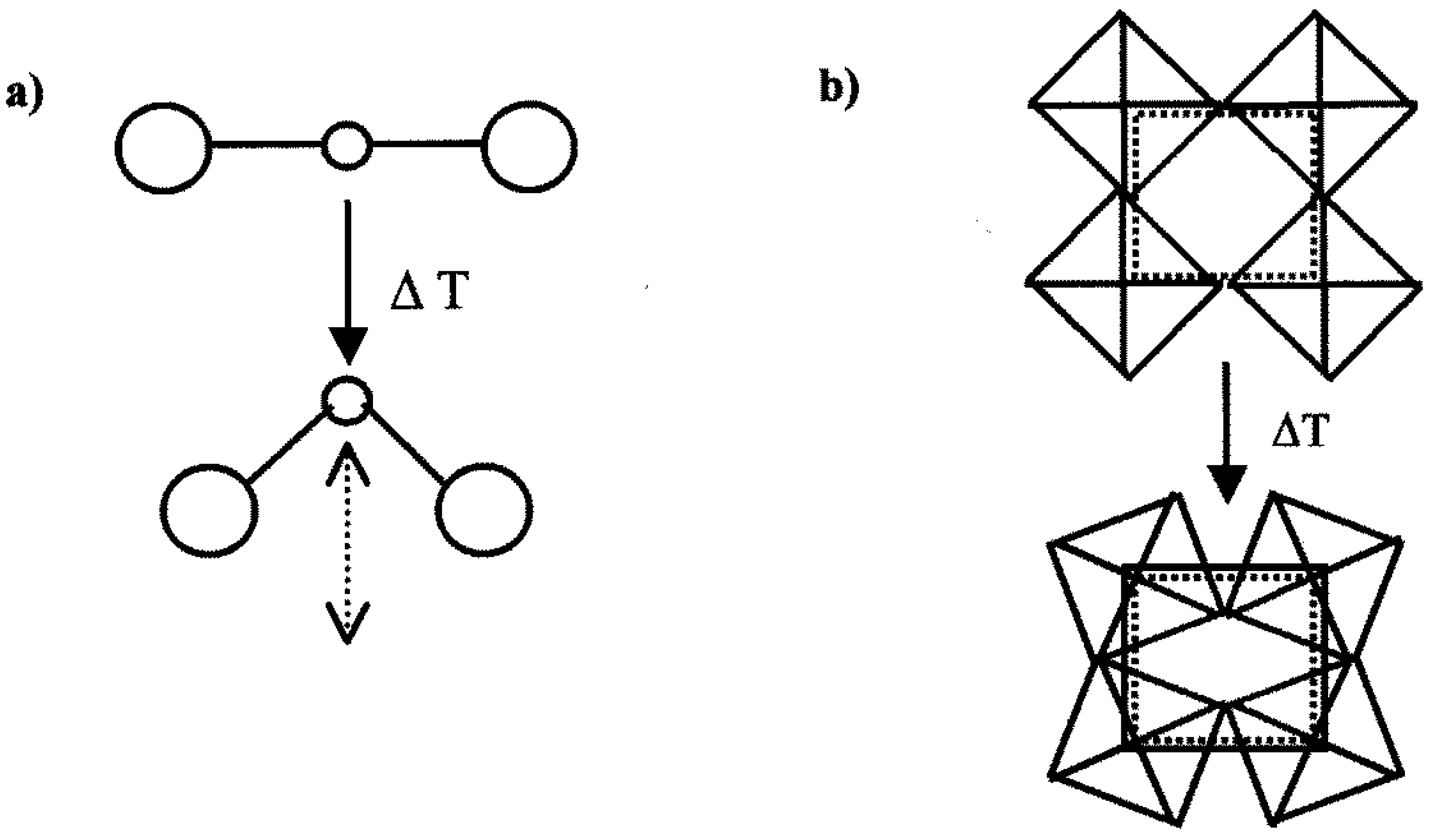 The mechanism of negative thermal expansion due to transverse atomic vibrations: (a) transverse motion of an oxygen atom in an M–O–M linkage; and (b) cooperative rocking of polyhedra causing a decrease in average metal-metal distances. The squares correspond to the locations of the metal atoms before (solid) and after (dotted) tilting.
