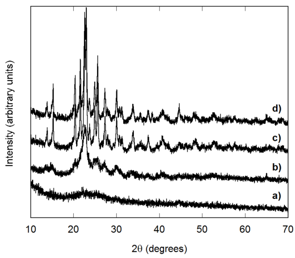 Laboratory PXRD data for AlScMo3O12 samples: (a) as recovered; (b) heated to 500 °C; (c) heated stepwise to 500, 600 and 700 °C; and (d) heated directly to 700 °C.