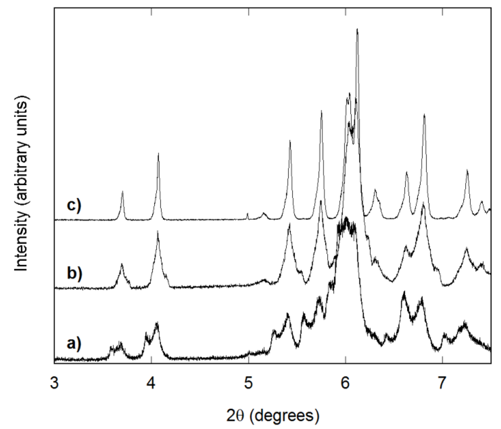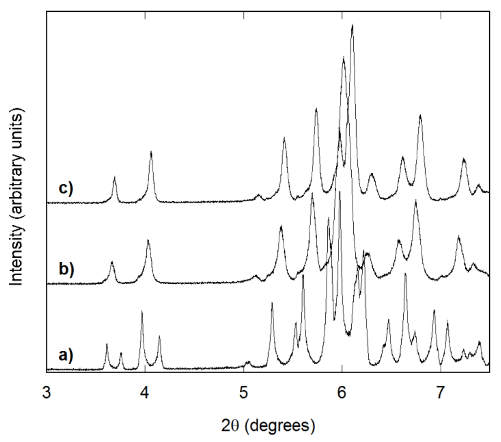 Synchrotron diffraction patterns of AlScMo3O12 samples prepared in 15 mL of CH3CN by heating at 130 °C for: (a) 7 days; (b) 17 days; and (c) 27 days.