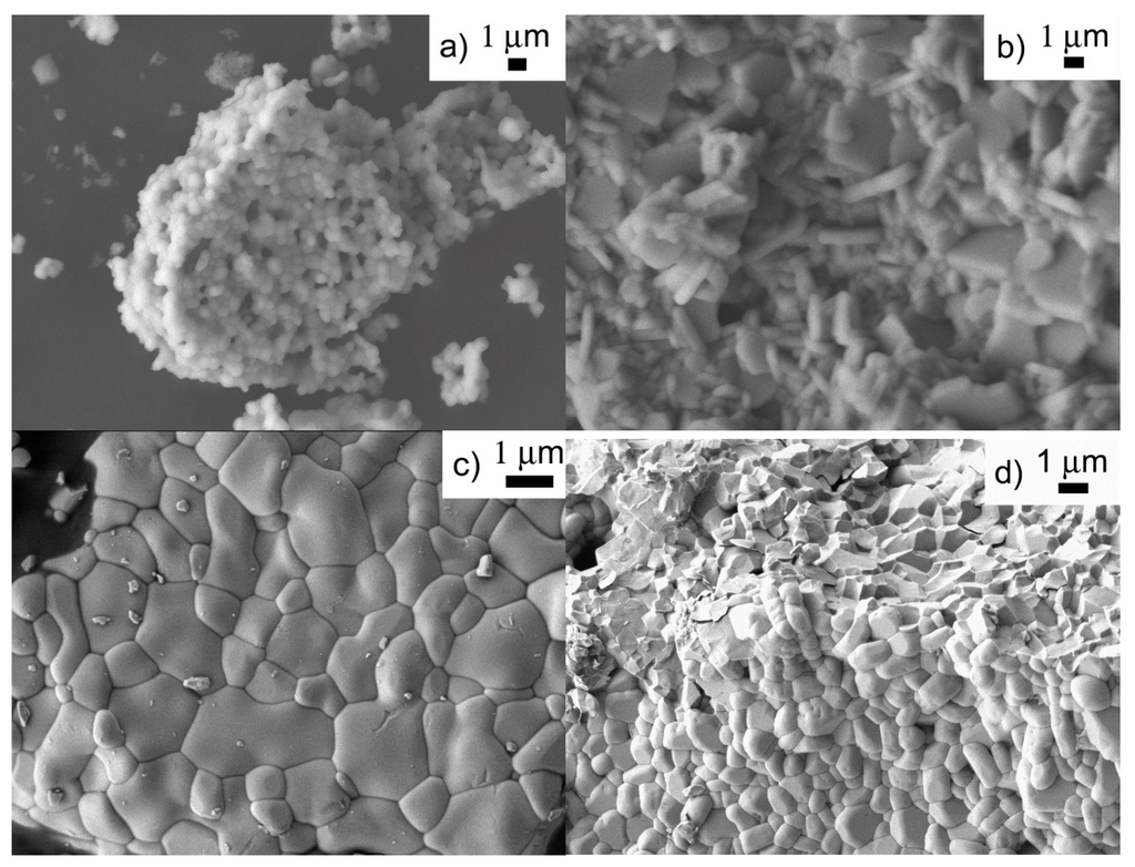 SEM images of samples prepared in: (a) CH3CN at 150 °C; (b) CH3CN at 170 °C for 7 days; (c) CHCl3 at 170 °C; and (d) CHCl3 at 110 °C. All images were recorded using heat-treated samples.