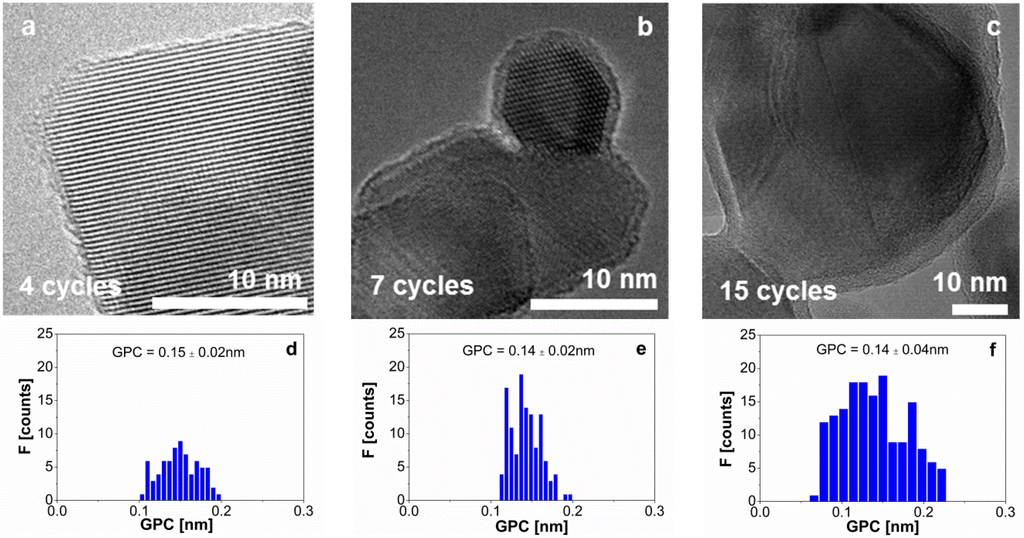 Figure 1a–c shows TEM pictures, and the distribution of the growth per cycle (Figure 1d–f) for the 4, 7, and 15 ALD-cycle experiments, respectively. The values of the growth per cycle are similar to the results reported for ALD experiments at a few millibars and ~180 °C, i.e., 0.1–0.2 nm. Although the histograms show some spread, from the TEM images we can see that the alumina coating on each particle is rather uniform and conformal. Figure 2a suggests a linear correlation between the number of cycles and the film thickness from TEM with a GPC of about 0.14–0.15 nm (Figure 2a), although it would require more data points to draw solid conclusions about linearity.