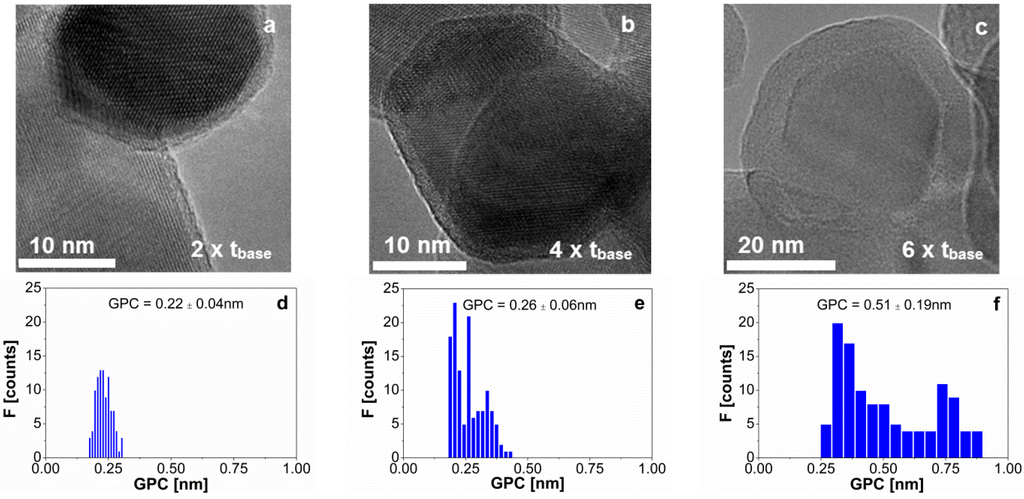 TEM image of the alumina film on TiO2 nanoparticles after 7 cycles when the dosing time of TMA per cycle is (a) 7 min; (b) 14 min; and (c) 21 min. The distribution of the GPC obtained from TEM images for a dosing time of TMA of (d) 7 min; (e) 14 min; and (f) 21 min. The mean and standard deviation values are shown in each histogram. The results in this figure can be compared with the ones of 7 cycles, with a dosing time of 3.5 min for TMA (Figure 1b,e), considered as the base case study.