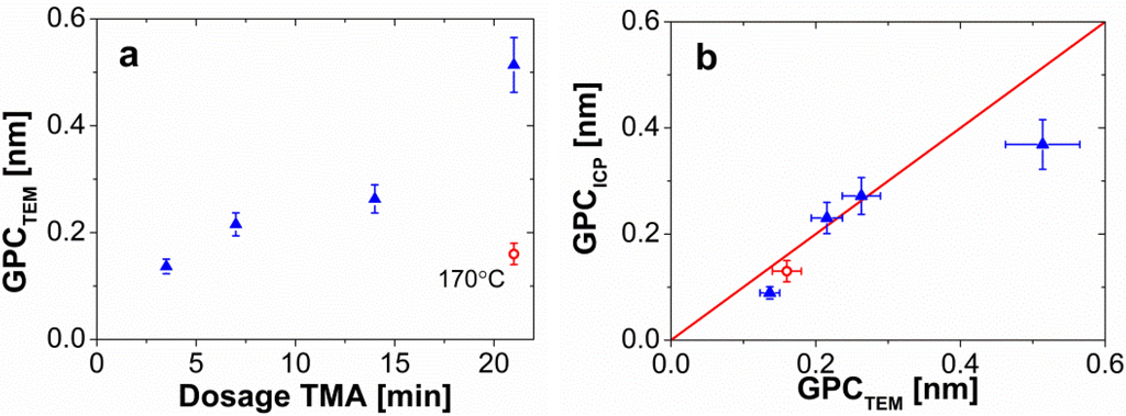 in the sample of 0.044 with ICP-OES, which translated into a film thickness of 0.66 nm and a GPC of 0.13 nm (Figure 4a, red-open circular symbol). To calculate these values we used an alumina density of 3000 kg/m3, typical for Al2O3 ALD at 177 °C [36]. The results of film thickness and GPC obtained from elemental analysis agree with the values from the TEM images (Figure 5), and in general, with the GPC reported for similar ALD experiments at <1 mbar and ~180 °C, i.e., 0.1–0.2 nm. The decrease in the GPC from 0.51 nm at room temperature to 0.16 nm at 170 °C (Figure 4a) indicates that the ALD reactions at these conditions, i.e., 1 bar and 170 °C, are self-limiting even when both precursors are fed in large excess.