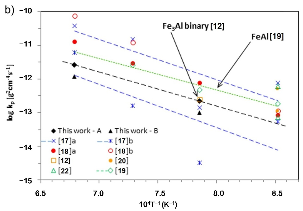 Time dependence of the square of mass grain per unit surface area vs. oxidation time for thin-walled prepared by LENS after processing and grinding (a) and Arrhenius plot for the parabolic rate constants of Fe3Al and FeAl (b). Own data are plotted in black, colors shows literature data from Table 1.