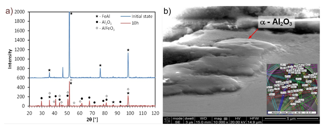 Alloys based on the ordered intermetallic Fe3Al phase are considered appropriate materials for high-temperature structural applications because of their low cost, low density, and good resistance to corrosion, oxidation, and sulfidation [10,11]. Satisfactory corrosion resistance of these alloys is associated with the development of accurate and well-adherent α-Al2O3-type oxides. However, depending on the time of exposure, temperature, and composition of the alloy (mainly Al content), their formation may be preceded by formation of iron oxides and metastable γ-, δ- and θ-Al2O3, which grow faster and have greater porosity and volume than the α variety, and therefore have lower resistance. Use of the alloying elements and micro additives also exerts a significant influence on the oxidation resistance of Fe-Al alloys. For example, stoichiometric Fe-28Al (at%) alloy were oxidized relatively slowly, even at 1000 °C in air [12]. Addition of Cr, aimed at improving mechanical properties, increased the oxidation rate despite the α-Al2O3 film formation and lack of Fe and Cr oxides. Selective oxidation of Al leads to the diffusion of Al and Cr atoms from the substrate to the oxide layer, making it brittle and incoherent (numerous exfoliations) [12]. Hotar and Palm [13] indicate that these oxides are adhesive when the temperature does not exceed 800 °C, but cause brittleness at higher temperatures. Thermal contraction associated with cooling causes exfoliation. Other authors confirm very good oxidation resistance of Fe-Al compounds [14,15,16], especially those alloyed with Zr [17,18,19], Nb [20], Ce [21], and Y2O3 [22].
