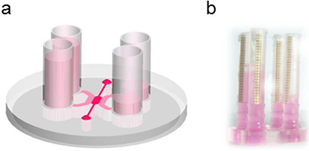 The gels were allowed to polymerize within the microfluidic devices, which were fabricated as described by Shin et al. [46]. Medium reservoir tubes were inserted into the channel outlets (shown in Figure 1) as described by Sudo et al. [48]. The difference in height of the media columns on both sides of the gel caused a pressure gradient of 500 or 13 mm of H2O for fibrin and collagen, respectively.