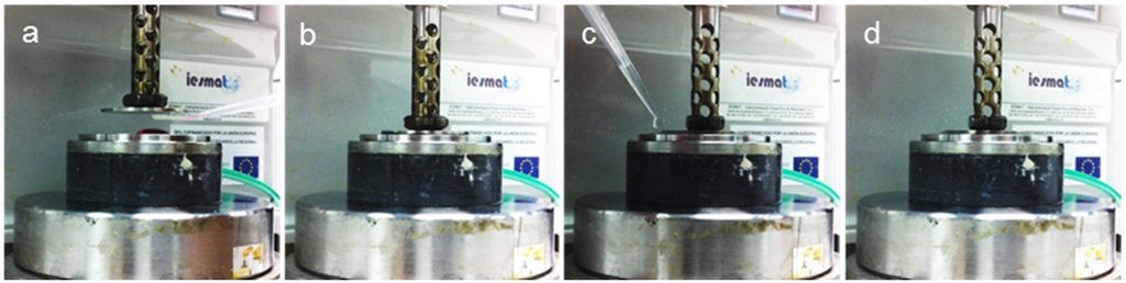 Image sequence of the gel filling process on the rheometer. Once the sample was mixed, it was pipetted in situ onto the rheometer plate (a); then, the gap was adjusted (b), and the sample was covered with oil (c) to prevent evaporation; the set-up was then ready to conduct the experiment (d).