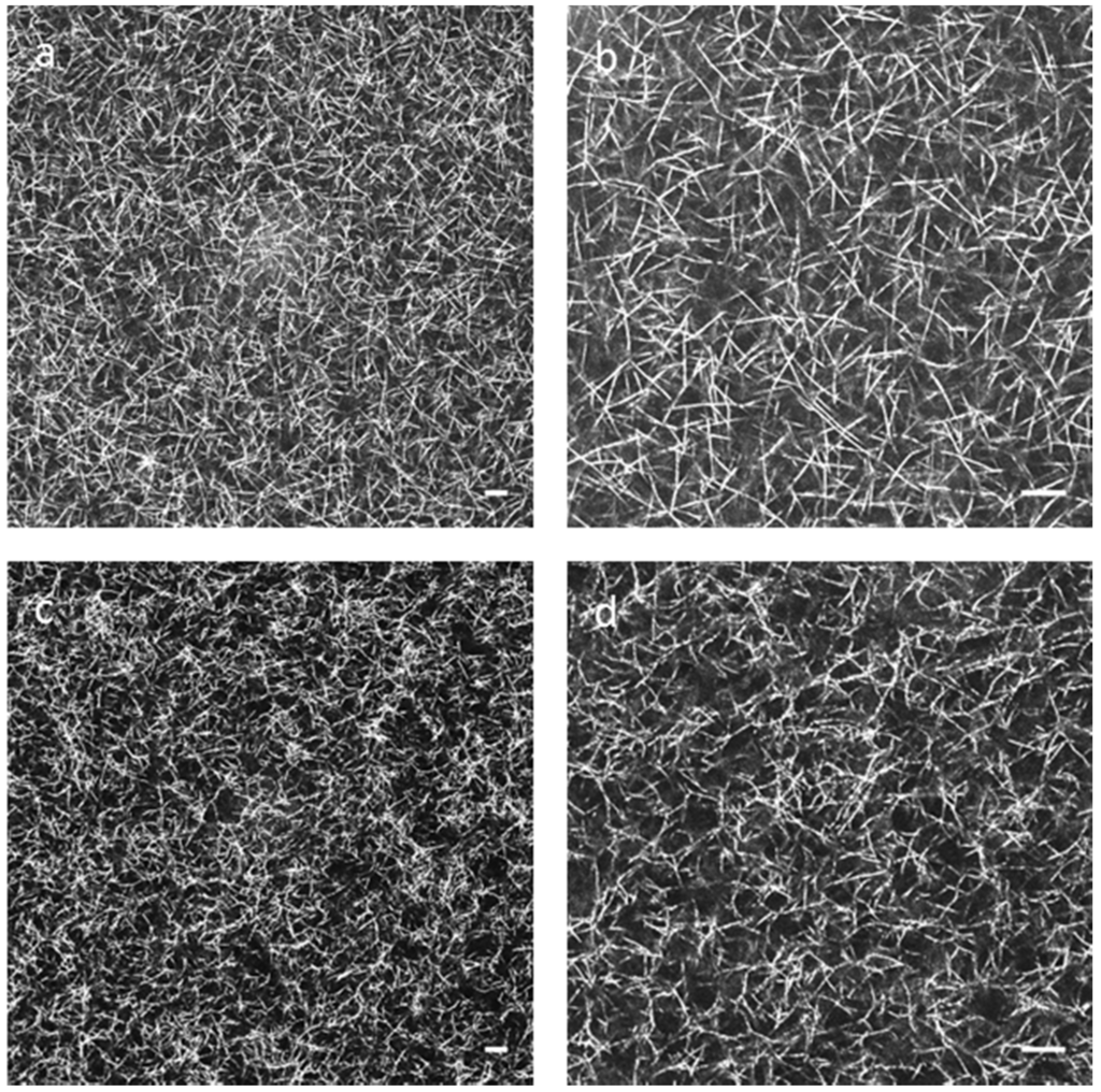 3D network of the hydrogels. The confocal reflection images show the arrangement of the fibrillar networks for (a,b) fibrin and (c,d) collagen gels. (a) and (c) show a general view; (b) and (d) are zoomed images of the right-bottom corner of the previous images, respectively. Fibers composing the collagen networks are twisted, whereas the fibers in the fibrin appear straighter. Scale bars correspond to 10 μm.