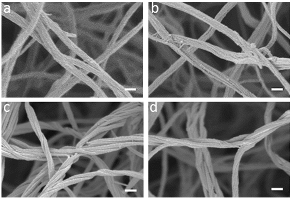 Fiber layout within hydrogels. SEM images of (a,b) fibrin and (c,d) collagen gels acquired at magnifications of 80–120 kX show the morphological features of the fibers. The collagen fibers exhibit characteristic bundling, whereas the fibrin fibers are formed more individually. The scale bars correspond to 200 nm.