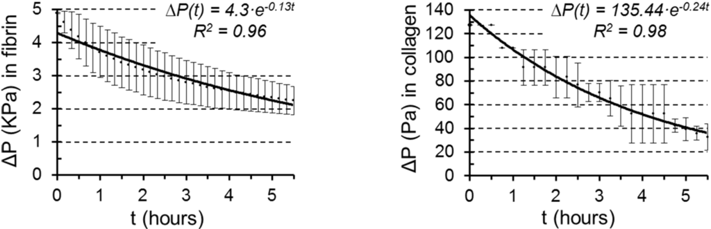 Pressure difference drop over time in hydrogels. The experimental data points of the pressure difference vs. time were plotted and fitted to an exponential function for fibrin (left) and collagen (right) gels. The resulting expressions and R2 values are also indicated. The exponent coefficient determines the value of the permeability ().
