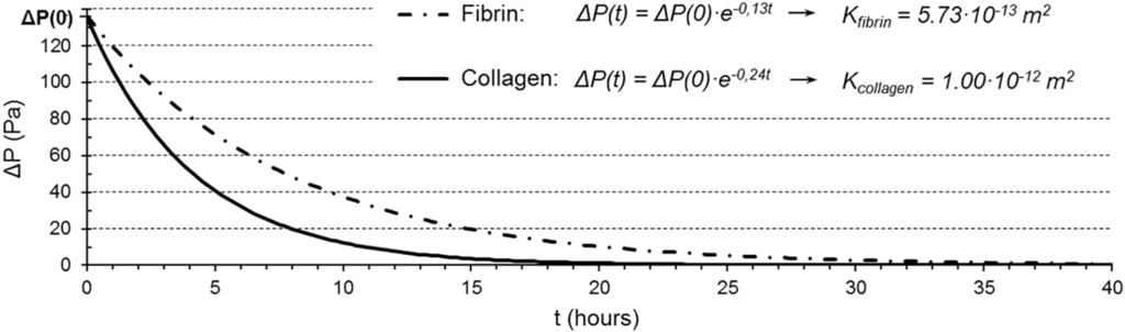 Comparison of the pressure difference drop for both hydrogels. The curves show the pressure difference drop over time for a given initial pressure difference for the collagen and fibrin hydrogels. Compared with collagen, the lower permeability (K) of the fibrin results in a slower function decay.