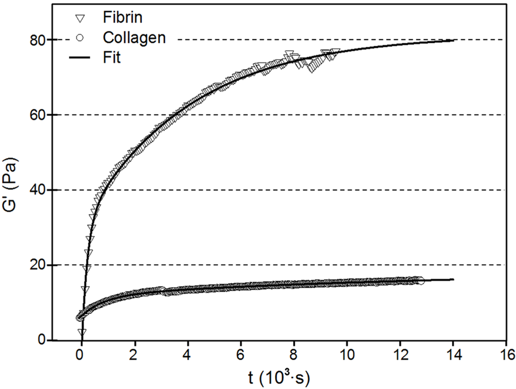 The fitted parameter values are shown in Table 3. The fast and slow processes may be associated with the fibrillogenesis of the filaments (fast) and the growth and crosslinking of these filaments (slow) to form a fiber network. Clearly, fibrin cured faster than collagen under the conditions studied and achieved significantly greater modulus values. Furthermore, the fast and the slow processes are more easily distinguishable in fibrin compared with collagen. Fibrin gels are cross-linked and stabilized by FXIII; accordingly, the complete cross-linking of a blood clot during coagulation takes longer than the formation of its fibrillar backbone [29], which could explain the differences in the polymerization kinetics of the hydrogels (see Figure 7). This fact could also explain why confocal scanning micrographs do not show much difference with or without ligation [38].
