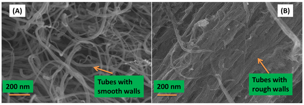 Morphology of (A) N-CNTs; and (B) nanocomposite of N-CNTs/P3HT synthesized by in situ polymerization.