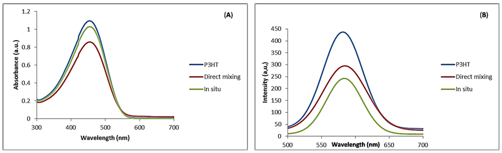 UV-visible absorption spectra of pristine P3HT and the nanocomposites in chloroform solution are presented in Figure 6A. The absorption maximum (λmax) for P3HT was observed at 442 nm, an indication of extensive π-conjugation [14]. The absorption peak for P3HT that we observed compared well with values reported in literature [27]. From the figure it was noted that N-CNTs did not make significant contribution to the spectra but a small red shift was noted to λmax of 445 nm for the nanocomposites synthesized with both techniques. Slight red shift of λmax can be attributed to an increased conjugation length of the polymer due to strong π–π interaction with N-CNTs as a result of increased organization of the polymer chains on the nanotube surface [32].