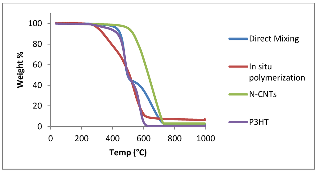 Raman spectra of N-CNTs and the nanocomposites were recorded with a DeltaNu Advantage 532TM Raman spectrometer (DeltaNu, Vancouver, BC, Canada). The excitation source was a Nd:YAG solid state crystal class 3b diode laser at 532 nm excitation wavelength. Nuspec TM software was used to capture generated spectra. Thermogravimetric analysis (TGA) was performed with a TA Instruments Q seriesTM thermal analyzer DSC/TGA (Q600). The P3HT, nanocomposites and N-CNTs were heated at a rate of 10 °C·min−1 under an air flow rate of 50 mL·min−1 and the data was captured and analyzed using the TA Instrument Universal Analysis 2000 software (TA Instrument, New Castle, DE, USA).