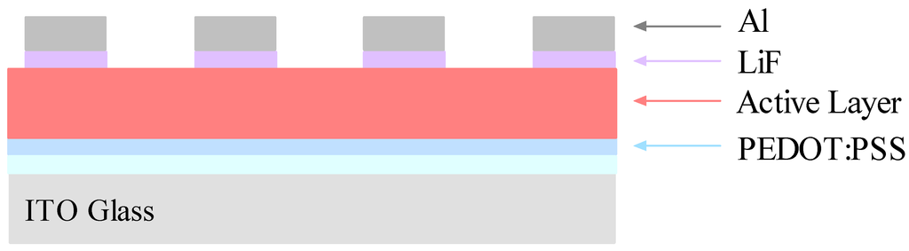 Several organic solar cells were fabricated by using a bulk heterojunction design in which the photoactive layer was composed of a blend of donor and acceptor molecules. Figure 8 shows a schematic diagram of the OSC device structure employed in this investigation. The electrical properties of the devices were studied by measuring the current-voltage (J-V) characteristics from each diode in the sample.