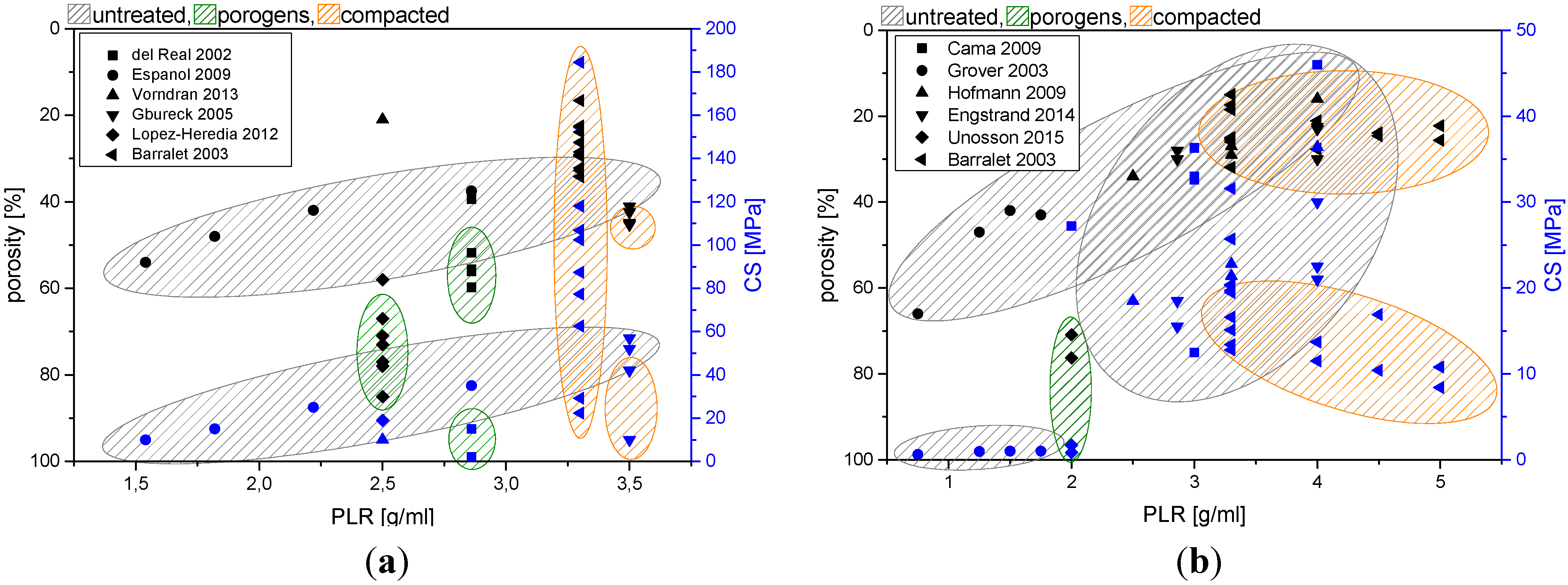 Correlation between powder to liquid ratio and porosity/compressive strength for (a) hydroxyapatite and (b) brushite cement from different studies. Cements were either set without compacting manipulation (untreated), processed by pre-compaction or porogens were added to create artificial macroporosity. Data were obtained from: (a) del Real 2002 [58], Espanol 2009 [47], Vorndran 2013 [59], Gbureck 2005 [27], Lopez-Heredia 2012 [60], Barralet 2003 [61], (b) Cama 2009 [62], Grover 2003 [51], Hofmann 2009 [50], Engstrand 2014 [49], Unosson 2015 [63], Barralet 2003 [64].