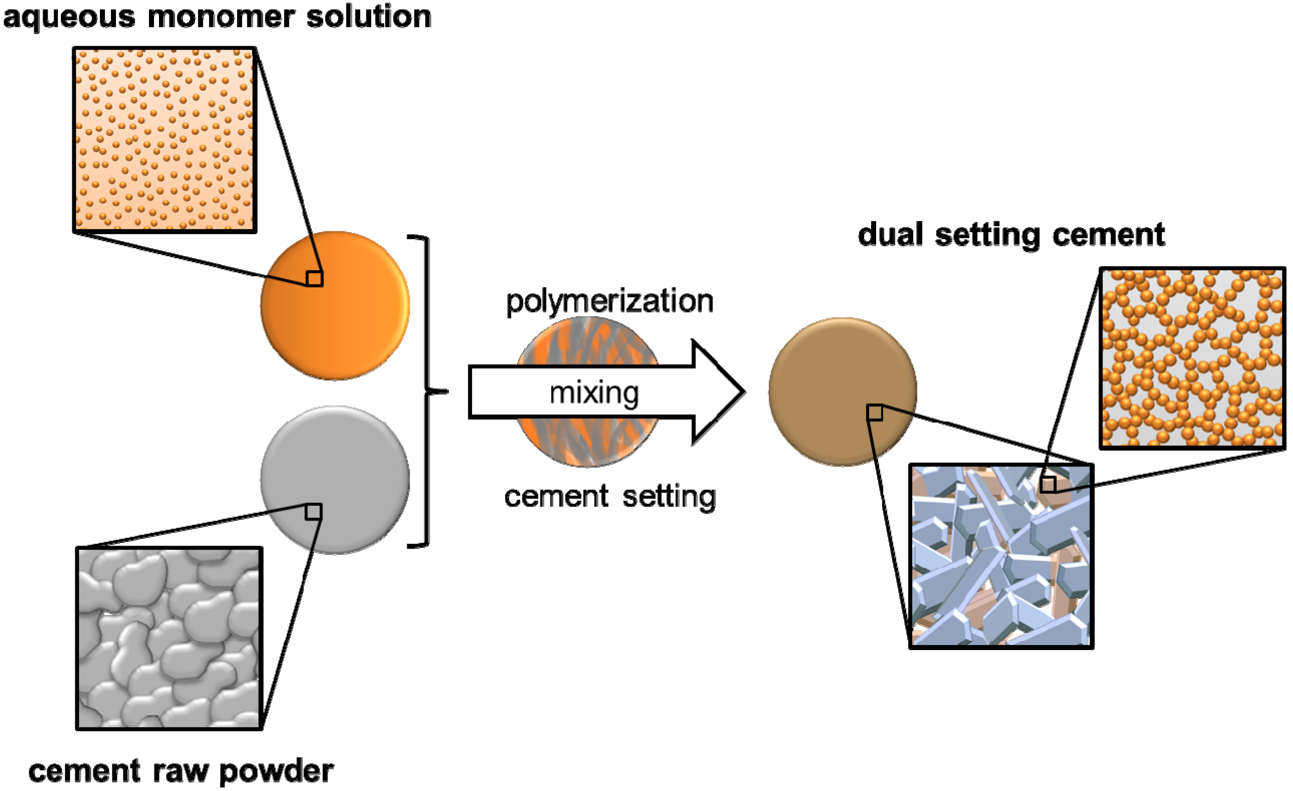 Hardening mechanism of dual-setting cements with the formation of interconnected matrices of hydrogel and precipitated cement crystals.
