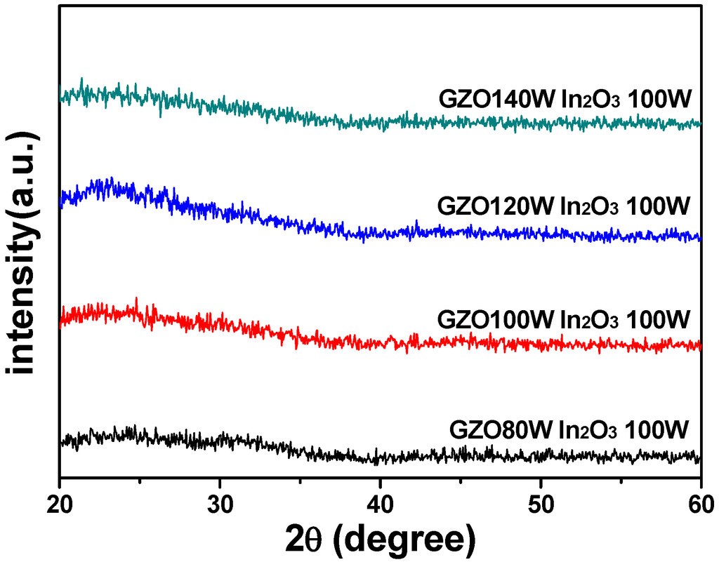 X-ray diffraction (XRD) patterns of In-Ga-Zn-O (IGZO) thin films as a function of deposition power of GZO ceramic target.