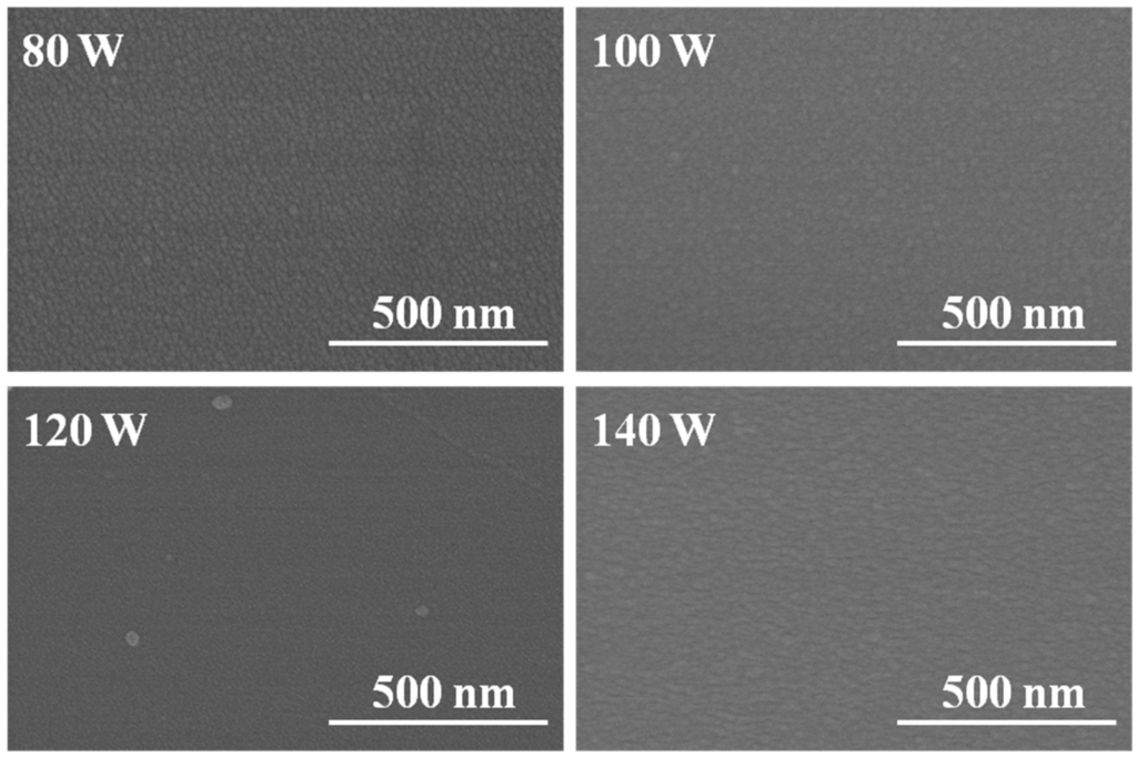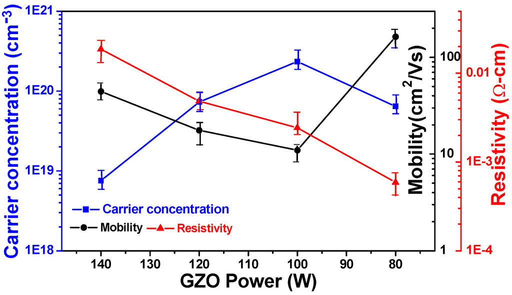 Figure 8 indicates that as the deposition power of GZO ceramic target was 80 W, 100 W, 120 W, and 140 W, the carrier concentration was 6.45 × 10