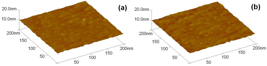 Figure 3a were in the range of 2.9 nm~4.5 nm and the average RMS value was 3.8 nm. The measured RMS roughness values for