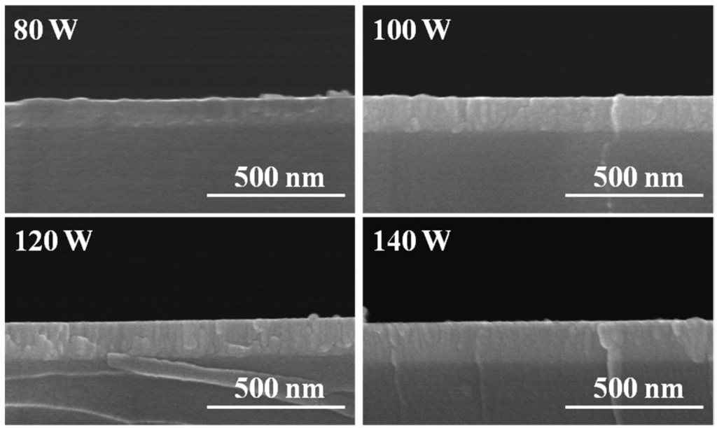 Figure 2 shows the cross-section observations of IGZO thin films as a function of deposition power of GZO ceramic target. As the results in