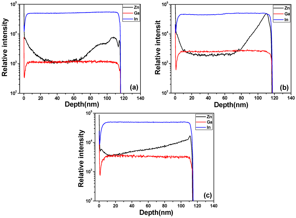 Because SIMS is a high sensitivity surface analysis technique for the determination of surface composition and contaminant analysis and for depth profile in the uppermost surface layers of a sample, it can detect very low concentrations of dopants and impurities. For that, the SIMS analysis was used to find the atomics’ concentrations of the constituent elements (In, Ga, and Zn) as a function of the sample’s depth to determine the elemental composition of the surface to a depth of about 120 nm, and the results are shown in