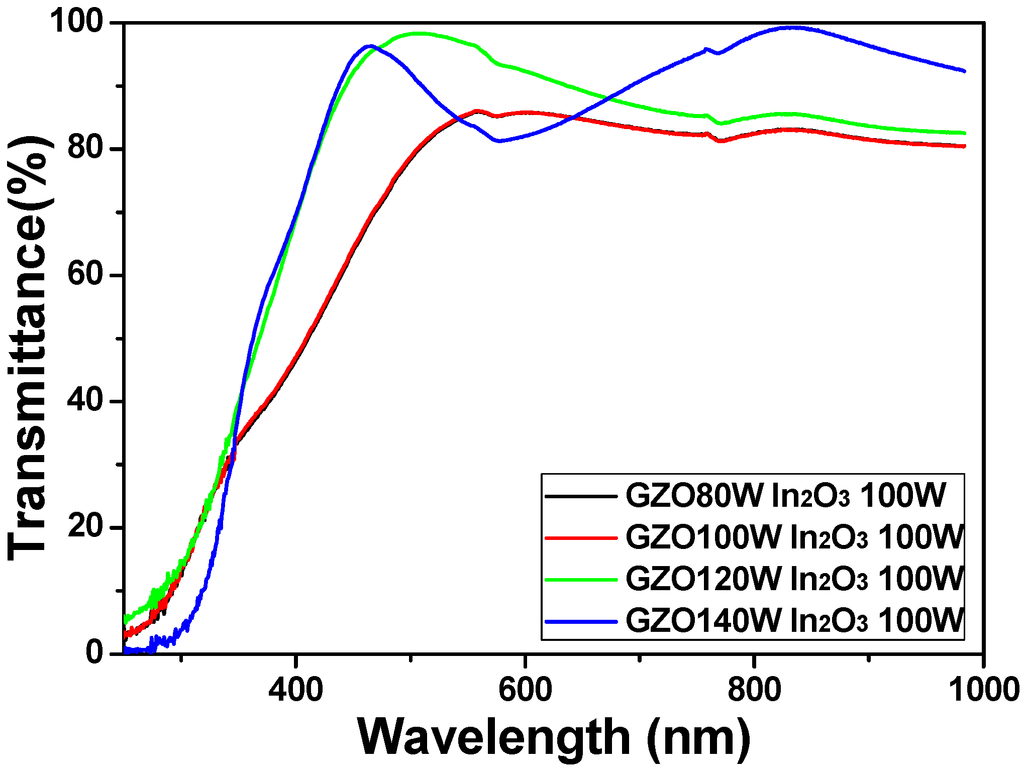 Figure 6 shows the transmittance ratios of IGZO thin films plotted against wavelengths in the region of 250–1000 nm, with deposition power of GZO ceramic target as the parameter. The results in