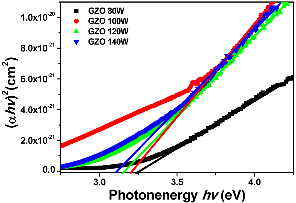 Α2 vs. hν-Eg Tauc plots of IGZO thin films as a function of deposition power of GZO ceramic target.